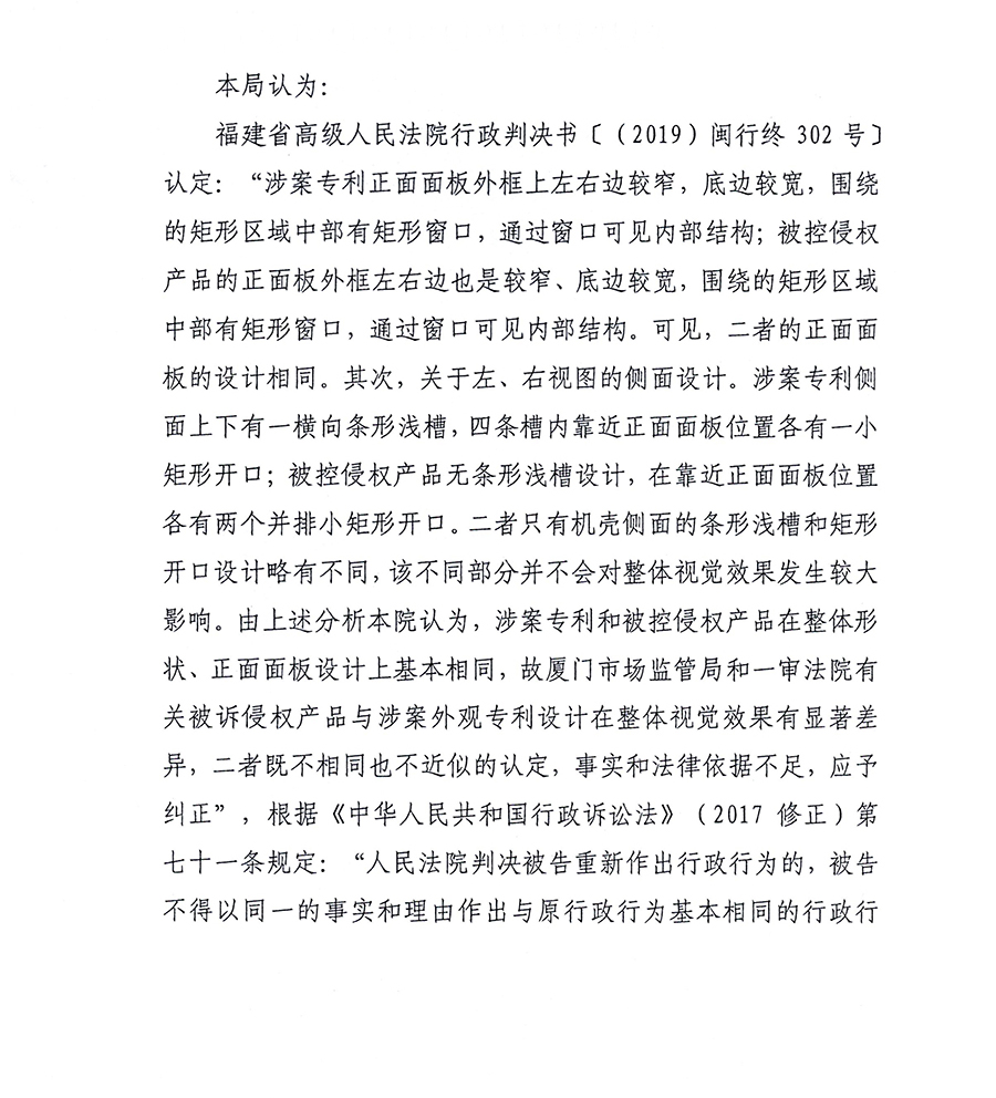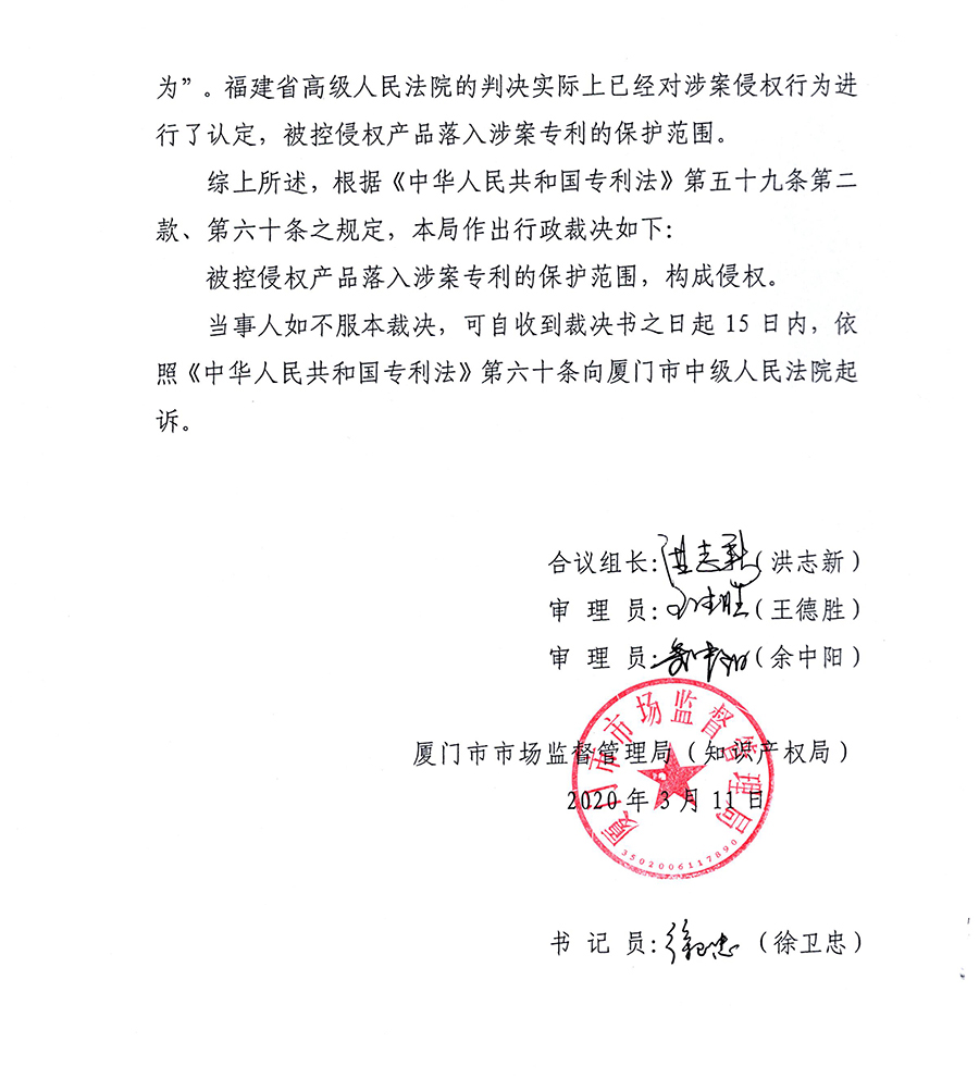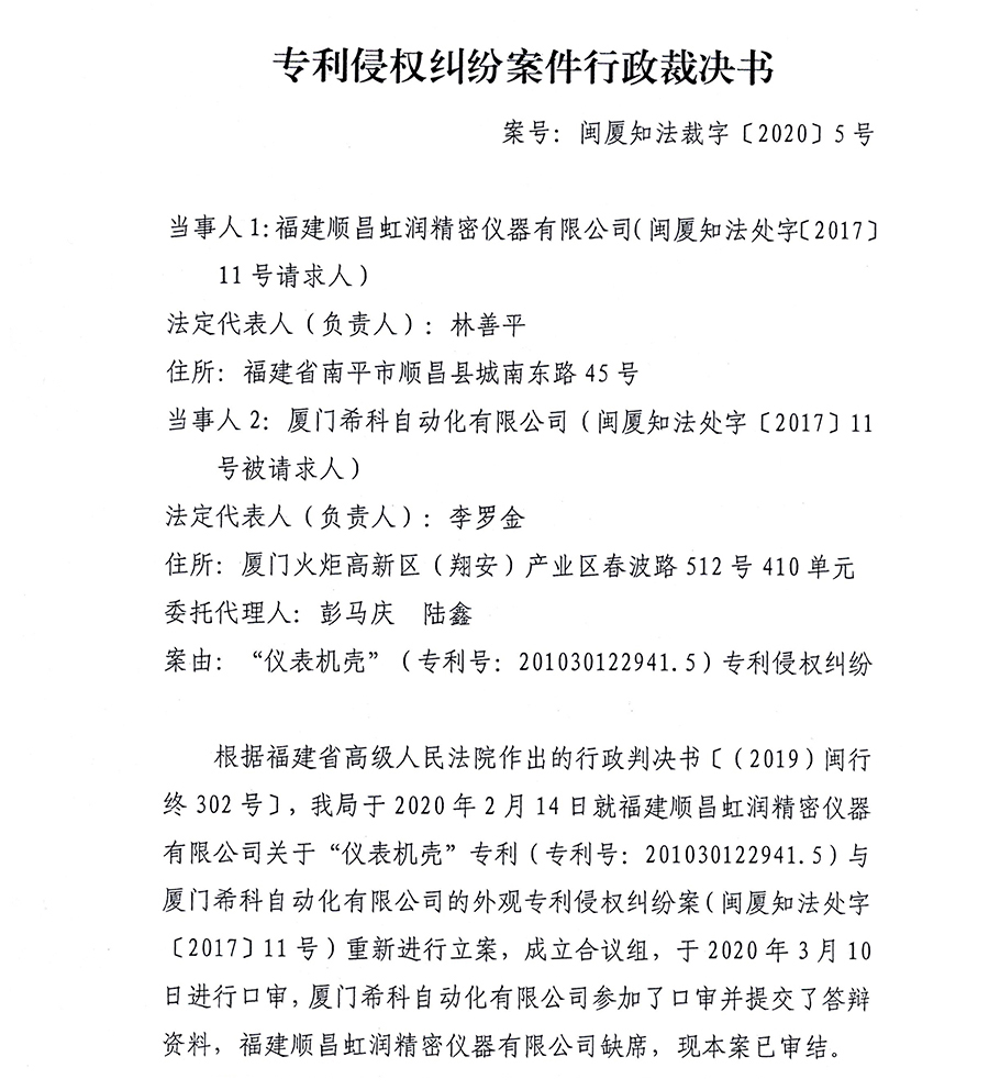 根據福建省高級人民法院作出的行政判決書[(2019)閩行終302號],廈門知識產權局于2020年2月14日就福建順昌虹潤精密儀器有限公司關于“儀表機殼”專利(專利號:201030122941.5)與廈門??谱詣踊邢薰就庥^侵權糾紛案(閩廈知法處字[2017]11號)重新進行立案,于2020年3月10日作出審結裁決,認定廈門??票豢氐臒o紙記錄儀侵權產品落入涉案專利的保護范圍,構成侵權。