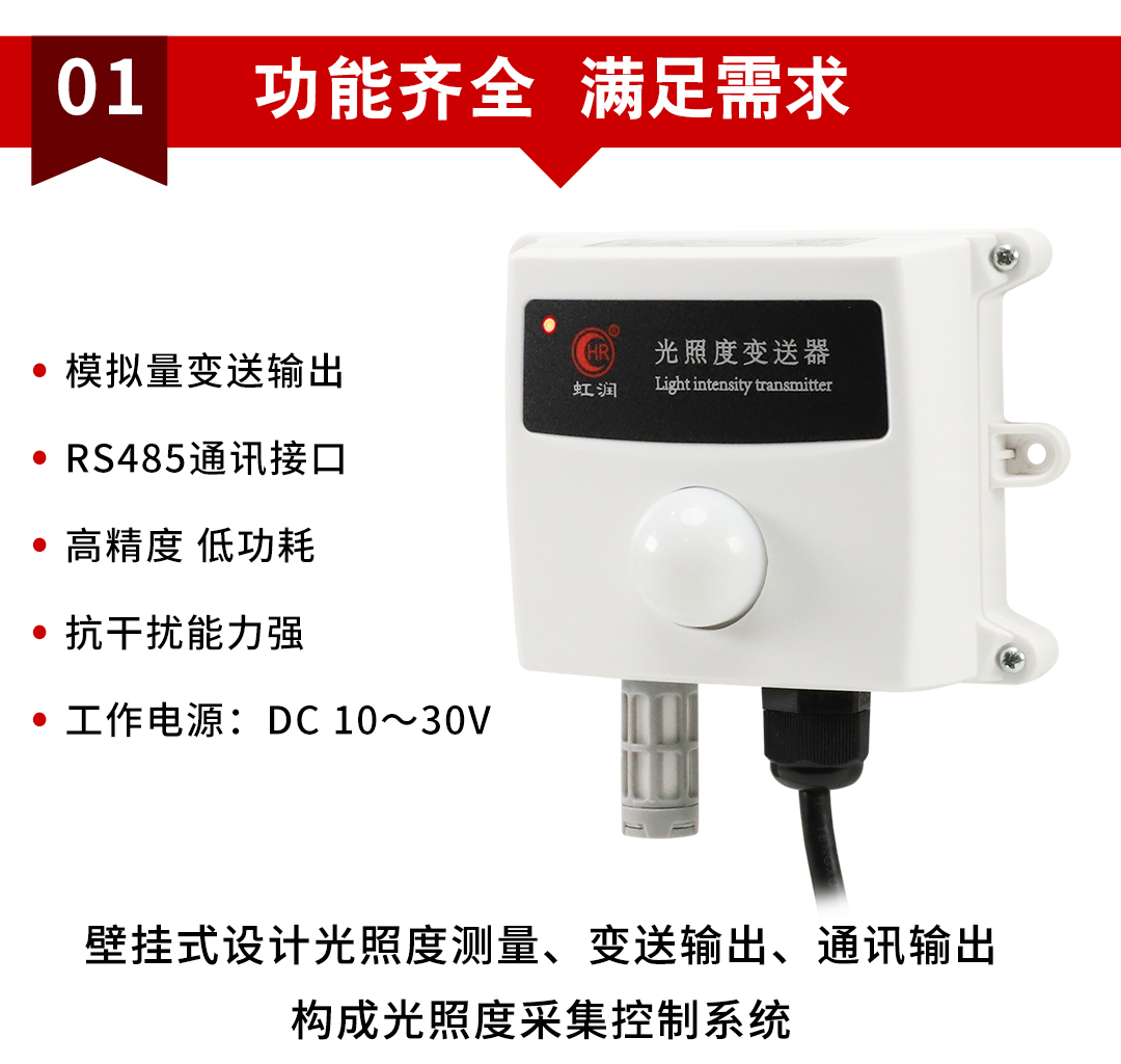 虹潤(rùn)公司是專業(yè)生產(chǎn)環(huán)境監(jiān)測(cè)儀表的國(guó)家專精特新“小巨人”企業(yè)。生產(chǎn)的光照度變送器,具有高精度感光傳感器,響應(yīng)靈敏,準(zhǔn)確度高,低功耗,模擬量變送輸出或RS485通訊等特點(diǎn)。產(chǎn)品獲得一種農(nóng)業(yè)監(jiān)控變送器、一種儀表電源等2項(xiàng)實(shí)用新型專利,主持起草現(xiàn)場(chǎng)設(shè)備集成等5項(xiàng)智能制造國(guó)家標(biāo)準(zhǔn),以及現(xiàn)場(chǎng)設(shè)備工具(FDT)接口規(guī)范、物聯(lián)網(wǎng)總體技術(shù)智能傳感器特性與分類等2項(xiàng)國(guó)家標(biāo)準(zhǔn),參與國(guó)際5G標(biāo)準(zhǔn)制定,取得農(nóng)業(yè)監(jiān)測(cè)變送器等3項(xiàng)相關(guān)軟件著作權(quán)。產(chǎn)品廣泛應(yīng)用于溫室大棚、花卉養(yǎng)殖、科研實(shí)驗(yàn)、智能樓宇、戶外照明等環(huán)境場(chǎng)合對(duì)光照度的檢測(cè)。