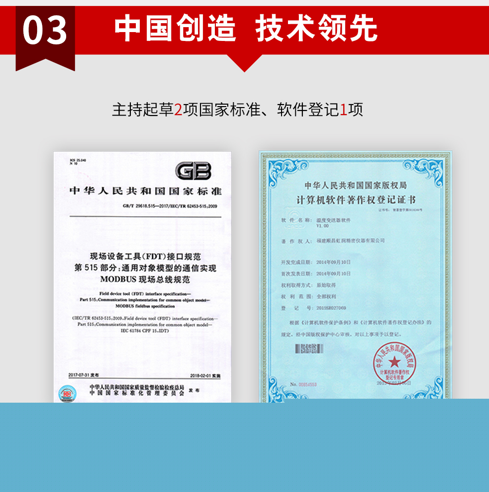 虹潤(rùn)公司是專業(yè)生產(chǎn)溫度變送器的國(guó)家專精特新“小巨人”企業(yè)。生產(chǎn)的現(xiàn)場(chǎng)顯示隔離溫度變送器,具有可修改輸入信號(hào)類型,測(cè)量精度高,穩(wěn)定性好,帶HART或RS485通訊計(jì)等特點(diǎn)。該產(chǎn)品不僅通過(guò)德國(guó)萊茵 CE 認(rèn)證與 SIL 功能安全認(rèn)證,還獲得具備減震抗干擾能力的溫度變送器、信號(hào)隔離器、一種二端子模塊、無(wú)源信號(hào)隔離器等3項(xiàng)國(guó)家發(fā)明專利。主持起草物聯(lián)網(wǎng)智能溫度儀表、現(xiàn)場(chǎng)設(shè)備工具(FDT)接口規(guī)范、工業(yè)過(guò)程測(cè)量和控制系統(tǒng)用溫度變送器等3項(xiàng)國(guó)家標(biāo)準(zhǔn),以及通信系統(tǒng)多通道數(shù)據(jù)采集控制終端規(guī)范軍用標(biāo)準(zhǔn)。參與國(guó)際5G標(biāo)準(zhǔn)制定,取得高精度溫度變送器等3項(xiàng)相關(guān)軟件著作權(quán)。產(chǎn)品廣泛應(yīng)用于石油、化工、電力、冶金、制藥、食品、水處理等各種工業(yè)領(lǐng)域。