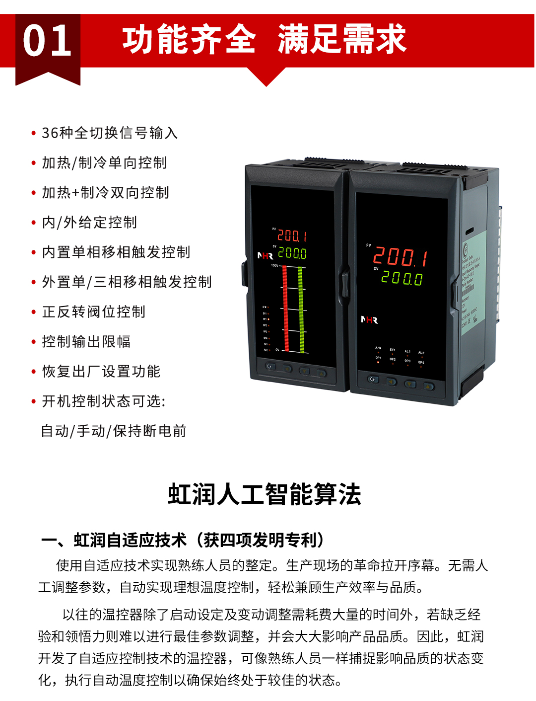 虹潤公司是專業(yè)生產(chǎn)溫控器的國家專精特新“小巨人”企業(yè)。生產(chǎn)的人工智能溫控器,具有真正人工智能算式,無需人工整定參數(shù),控制精度可達(dá)±0.1°C,多種輸出類型,高抗干擾等特點(diǎn)。產(chǎn)品獲得模糊PID控制儀及控制方法、人工智能調(diào)節(jié)器、智能化控制器、移相觸發(fā)控制器、閥門自動(dòng)手動(dòng)無擾動(dòng)操作控制方法及裝置等5項(xiàng)國家發(fā)明專利,主持起草工業(yè)過程控制系統(tǒng)用模擬輸入兩位或多位輸出儀表、物聯(lián)網(wǎng)智能溫度儀表通用技術(shù)條件、工業(yè)過程測(cè)量和控制系統(tǒng)用智能調(diào)節(jié)器等3項(xiàng)國家標(biāo)準(zhǔn),以及通信系統(tǒng)多通道數(shù)據(jù)采集控制終端規(guī)范軍用標(biāo)準(zhǔn),參與國際5G標(biāo)準(zhǔn)制定,取得模糊PID溫控儀等3項(xiàng)相關(guān)軟件著作權(quán)。產(chǎn)品廣泛應(yīng)用于電力、石化,冶金、制藥、食品等幾乎所有工業(yè)現(xiàn)場(chǎng),實(shí)現(xiàn)精準(zhǔn)控溫,保障生產(chǎn)安全與質(zhì)量。