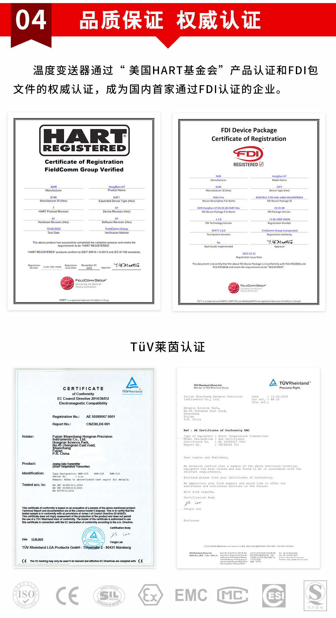 虹潤公司是專業(yè)生產(chǎn)溫度變送器的國家專精特新“小巨人”企業(yè)。生產(chǎn)的智能溫度變送器,具有適配各類溫度傳感器,精度高,通過編程線修改輸入信號類型及量程,高抗干擾,HART或485通訊等特點。該產(chǎn)品不僅通過HART基金會認證、德國萊茵 CE 認證與 SIL 功能安全認證,還獲得具備減震抗干擾能力的溫度變送器、信號隔離器、一種二端子模塊、無源信號隔離器等4項國家發(fā)明專利,主持起草物聯(lián)網(wǎng)智能溫度儀表、現(xiàn)場設(shè)備工具(FDT)接口規(guī)范、工業(yè)過程測量和控制系統(tǒng)用溫度變送器等3項國家標(biāo)準(zhǔn),以及通信系統(tǒng)多通道數(shù)據(jù)采集控制終端規(guī)范軍用標(biāo)準(zhǔn),參與國際5G標(biāo)準(zhǔn)制定,取得HART溫度變送器、智能溫度變送器等3項相關(guān)軟件著作權(quán)。產(chǎn)品廣泛應(yīng)用于石油、化工、電力、冶金、制藥、食品、水處理等各種工業(yè)領(lǐng)域。