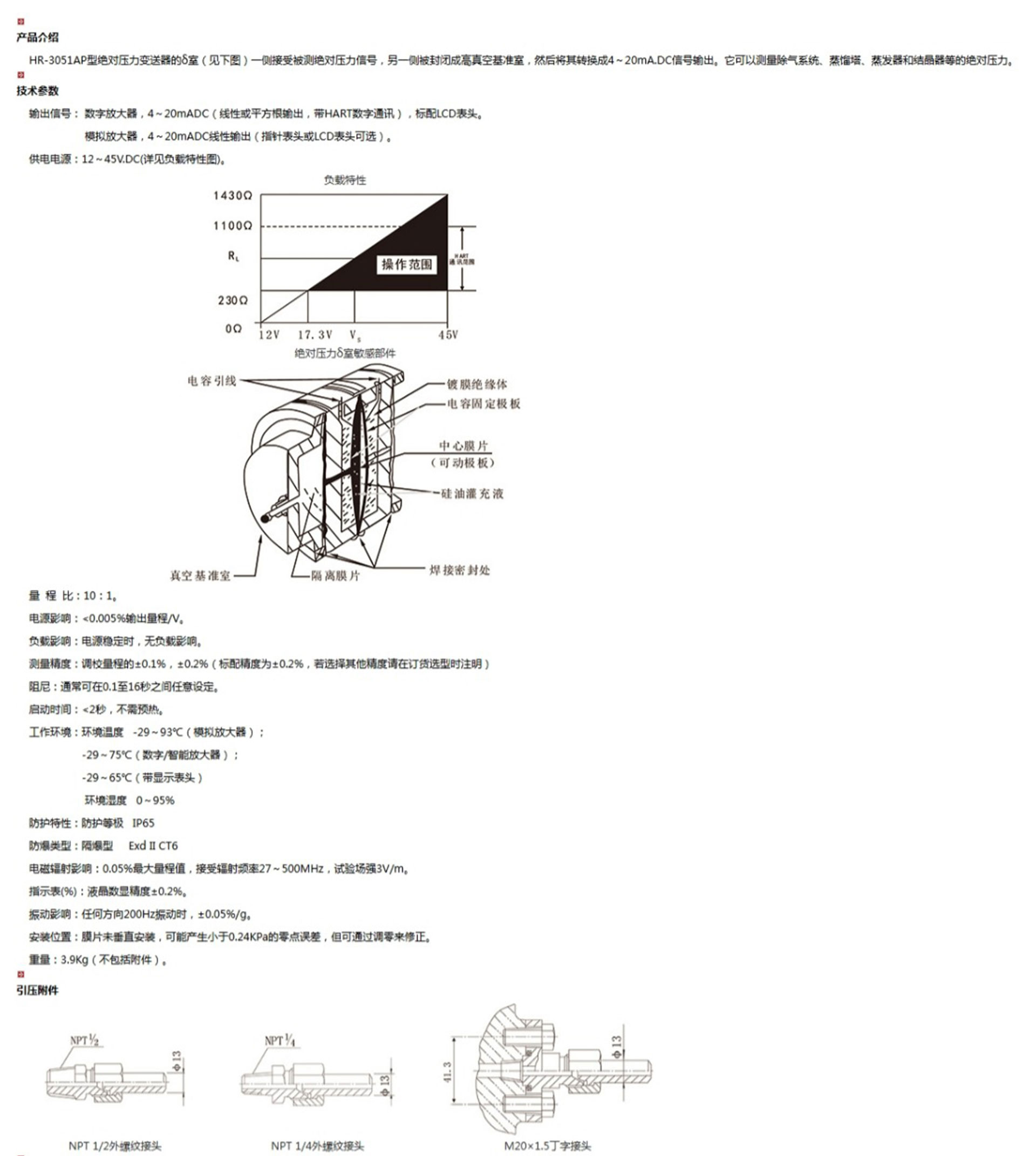 HR-3051AP型絕對(duì)壓力變送器的δ室(見下圖)一側(cè)接受被測(cè)絕對(duì)壓力信號(hào),另一側(cè)被封閉成高真空基準(zhǔn)室,然后將其轉(zhuǎn)換成4~20mA.DC信號(hào)輸出。它可以測(cè)量除氣系統(tǒng)、蒸餾塔、蒸發(fā)器和結(jié)晶器等的絕對(duì)壓力。