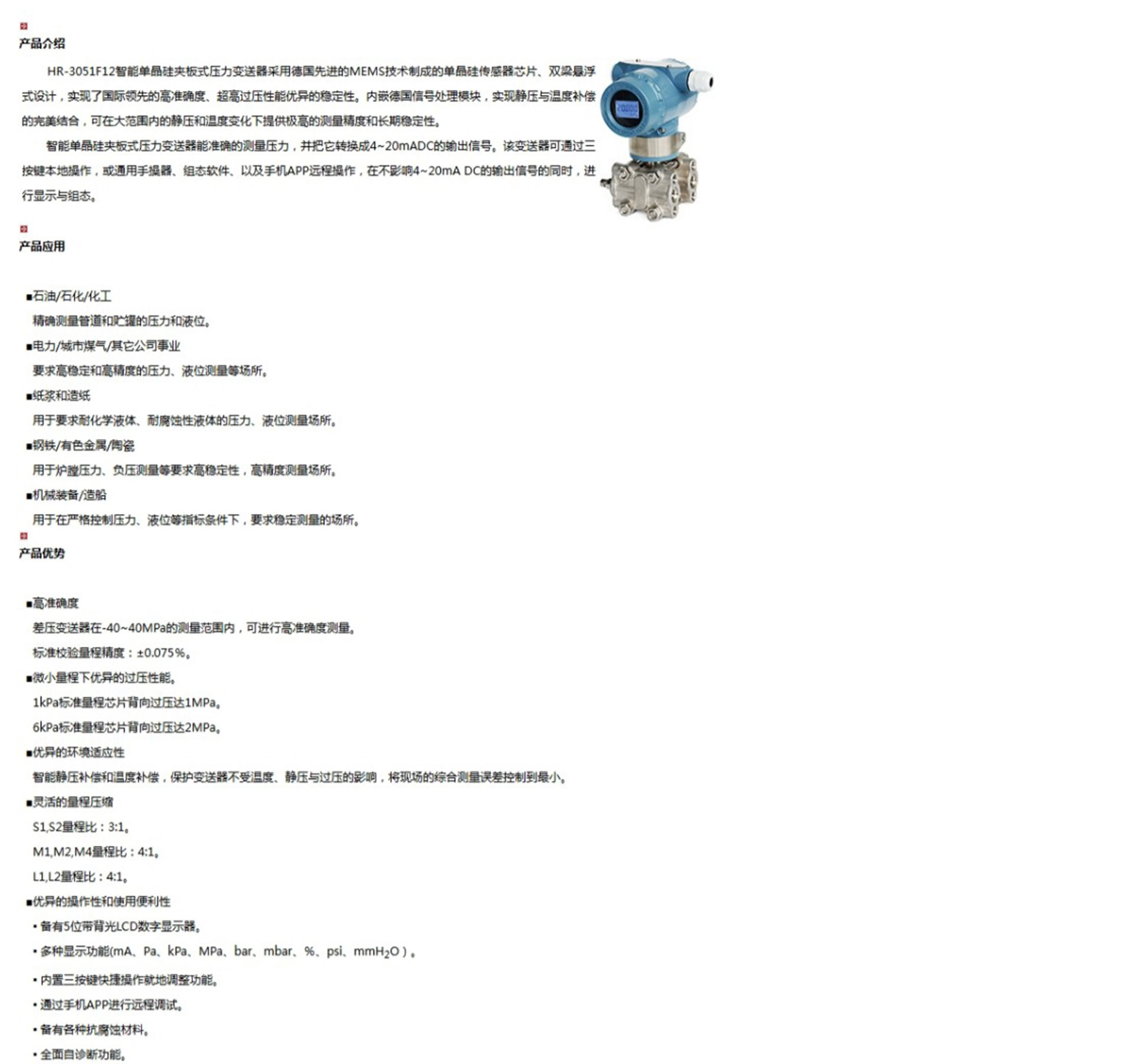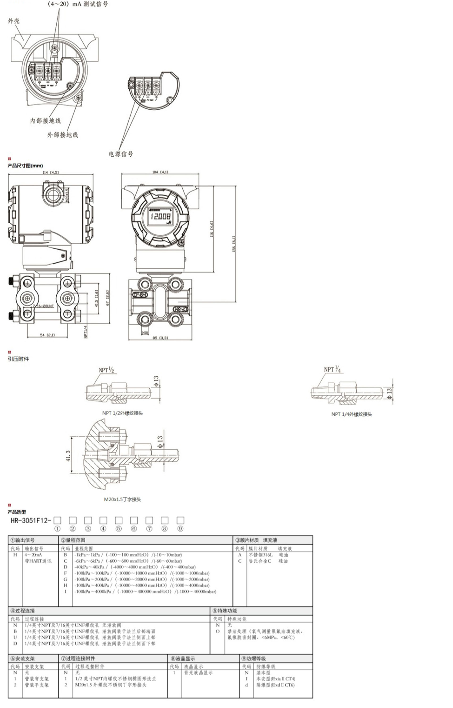 HR-3051F12智能單晶硅夾板式壓力變送器能準(zhǔn)確的測量壓力,并把它轉(zhuǎn)換成4~20mADC的輸出信號(hào)。該變送器可通過三按鍵本地操作,或通用手操器、組態(tài)軟件、以及手機(jī)APP遠(yuǎn)程操作,在不影響4~20mA DC的輸出信號(hào)的同時(shí),進(jìn)行顯示與組態(tài)。